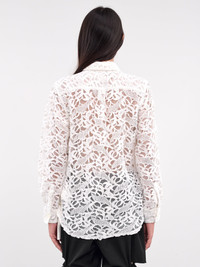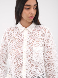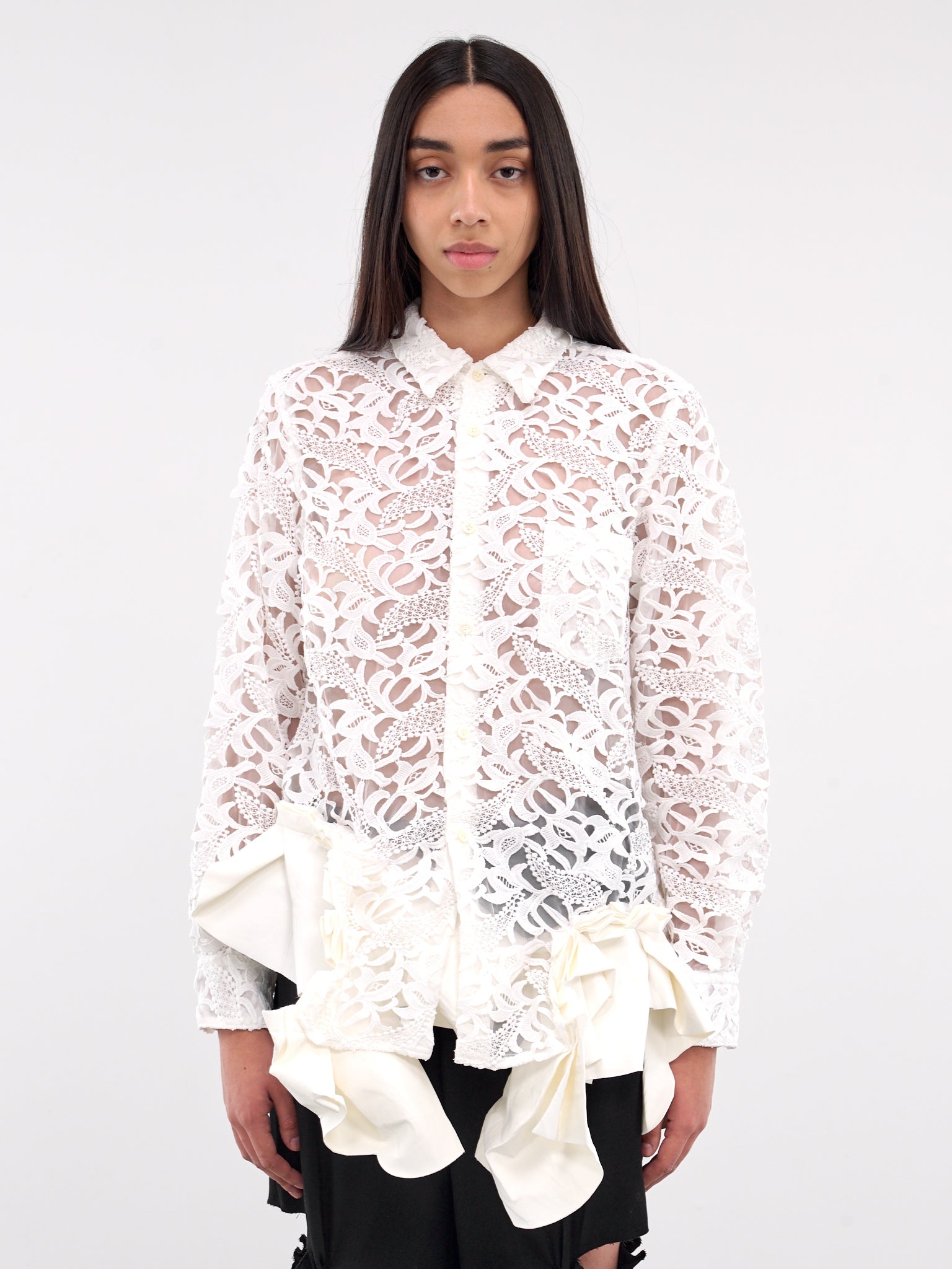 COMME DES GARCONS shirt in off-white, cotton lace & faux leather construction, lace pattern, semi-sheer, spread collar, front button placket closure, long sleeves, button cuffs, chest patch pocket, faux leather appliques, asymmetric hem, regular fit. Made in Japan Cotton & Faux Leather Standard Sizing Model is 5'7" wearing size S. Bust: 32.5" Waist: 24" Hips: 32"
