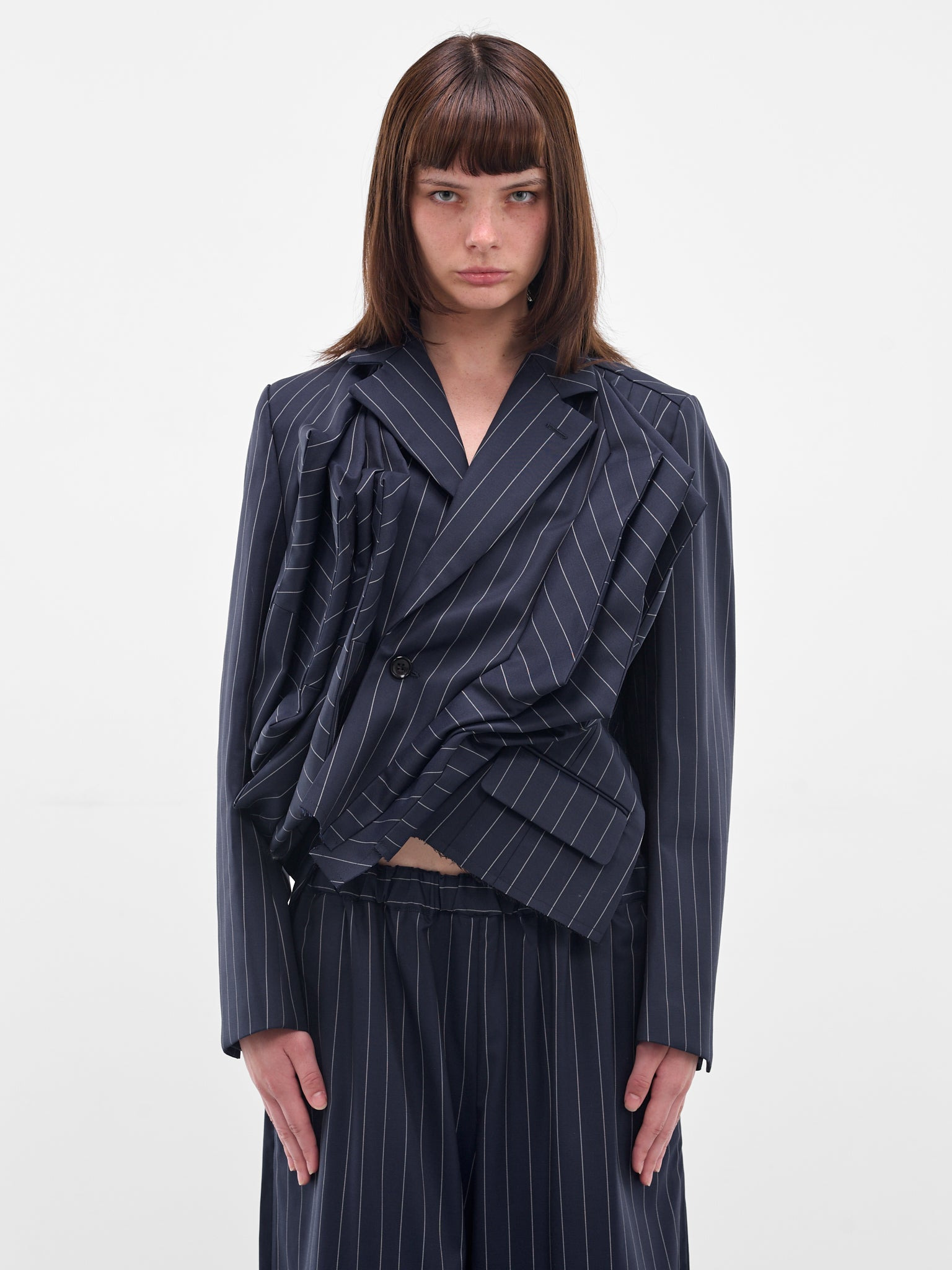 Navy pinstripe blazer with a sculptural silhouette. Defined by twisted and layered draping with raw hems and warped flap pockets. Featuring: • Relaxed fit • Pinstripe pattern • Notched lapel • Structured shoulders and long sleeves • Surgeon’s cuffs • Side vents • Raw hems • 83% Wool 16% Sisal 1% Polyester • Standard sizing Model is 5'7" wearing size S. Bust: 30" Waist: 22" Hips: 33"