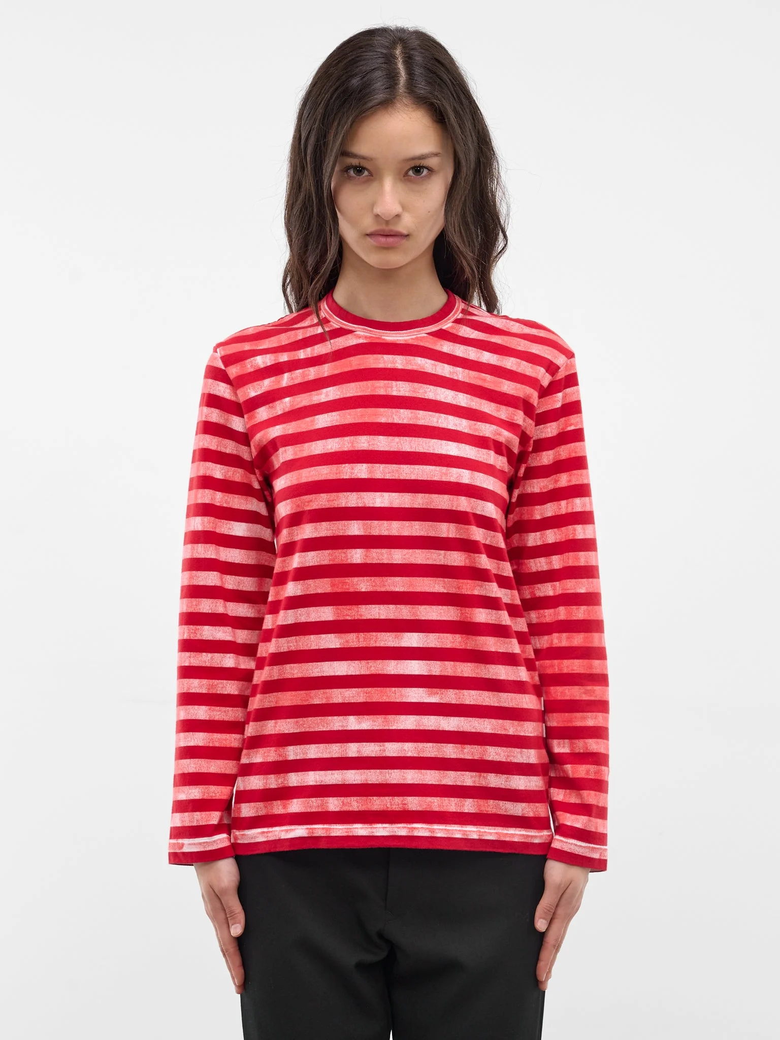 T-shirt in red with a striped construction, featuring faded spray print across a long sleeve silhouette. Featuring: • Regular fit • Striped pattern • Faded spray print • Crewneck • Long sleeves • Standard sizing Model is 5'8.5" wearing size S. Bust: 32” Waist: 24” Hips: 34”