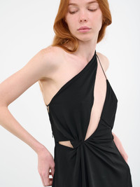 COPERNI dress in black, stretch jersey, slashed chest, asymmetric neckline & hem, gathered detailing, open back, high side slit, midi length, flared hem, slim fit. Made in Italy French Sizing 100% Viscose Model is 5'9" wearing size 34. Bust: 31.5" Waist: 23" Hips: 34"