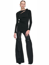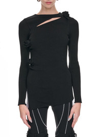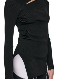COPERNI top in black, asymmetric rib design, slashed & rose details, round neck, side slit, full length, asymmetric hem, slim fit. Standard Sizing Model is 5'9" wearing size XS. Bust: 32" Waist: 24" Hip: 35.5"
