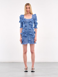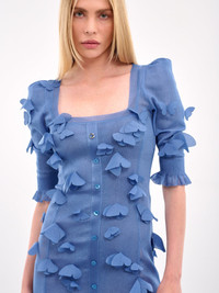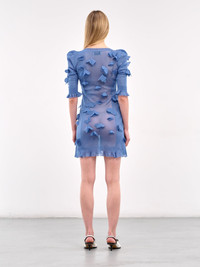 COPERNI dress in blue, paneled construction, all-over butterfly applique embellishment, squared neckline, ribbed collar, half sleeves, flared cuffs, front button placket closure & signature logo hardware, rib-knit hem & flared hemline, mini-length, slim fit. Standard Sizing Model is 5'8" wearing size S. Bust: 32" Waist: 24" Hips: 35"