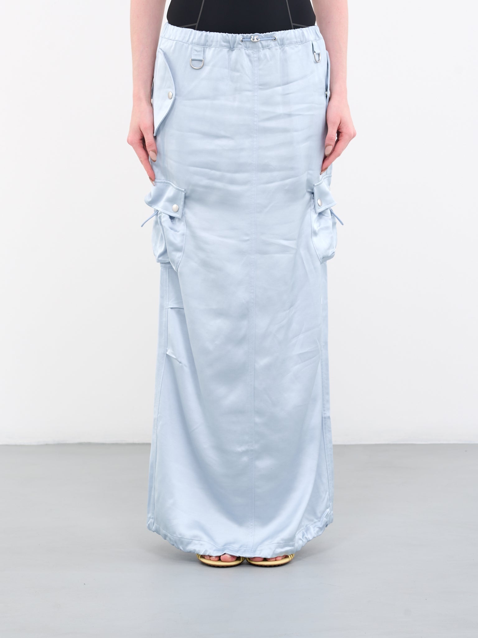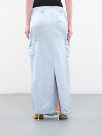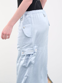 COPERNI skirt in blue, cargo design, satin fabric, mid-elastic waist, bungee cord fastening, d-ring details, five cargo pockets, woven logo label, back slit, maxi length, regular fit. Made in Portugal Italian Sizing Model is 5'7.5" wearing size 36. Bust: 32" Waist: 24" Hips: 34"