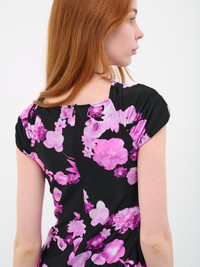 COPERNI top in black pink, stretch jersey, floral print, ruched & cut-out detailing, twisted neckline, long sleeves, cropped, fitted. Made in Portugal Standard Sizing 100% Polyamide Model is 5'9" wearing size XS. Bust: 31.5" Waist: 23" Hips: 34"