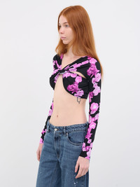 COPERNI top in black pink, draped design, stretch jersey, floral print, ruched & cut-out detailing, criss-cross neckline, long sleeves, cropped, fitted. Made in Portugal Standard Sizing 100% Polyamide Model is 5'9" wearing size XS. Bust: 31.5" Waist: 23" Hips: 34"