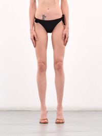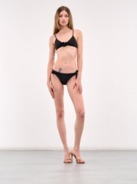 COPERNI bikini bottom in black, paneled stretch nylon construction, low waist, side self-tie fastening, side flower applique embellishment, sleeveless, low-cut, form fit. Made in Portugal 85% Polyamide 15% Elastane Standard Sizing Model is 5'9" wearing size S. Bust: 32" Waist: 23" Hips: 34"