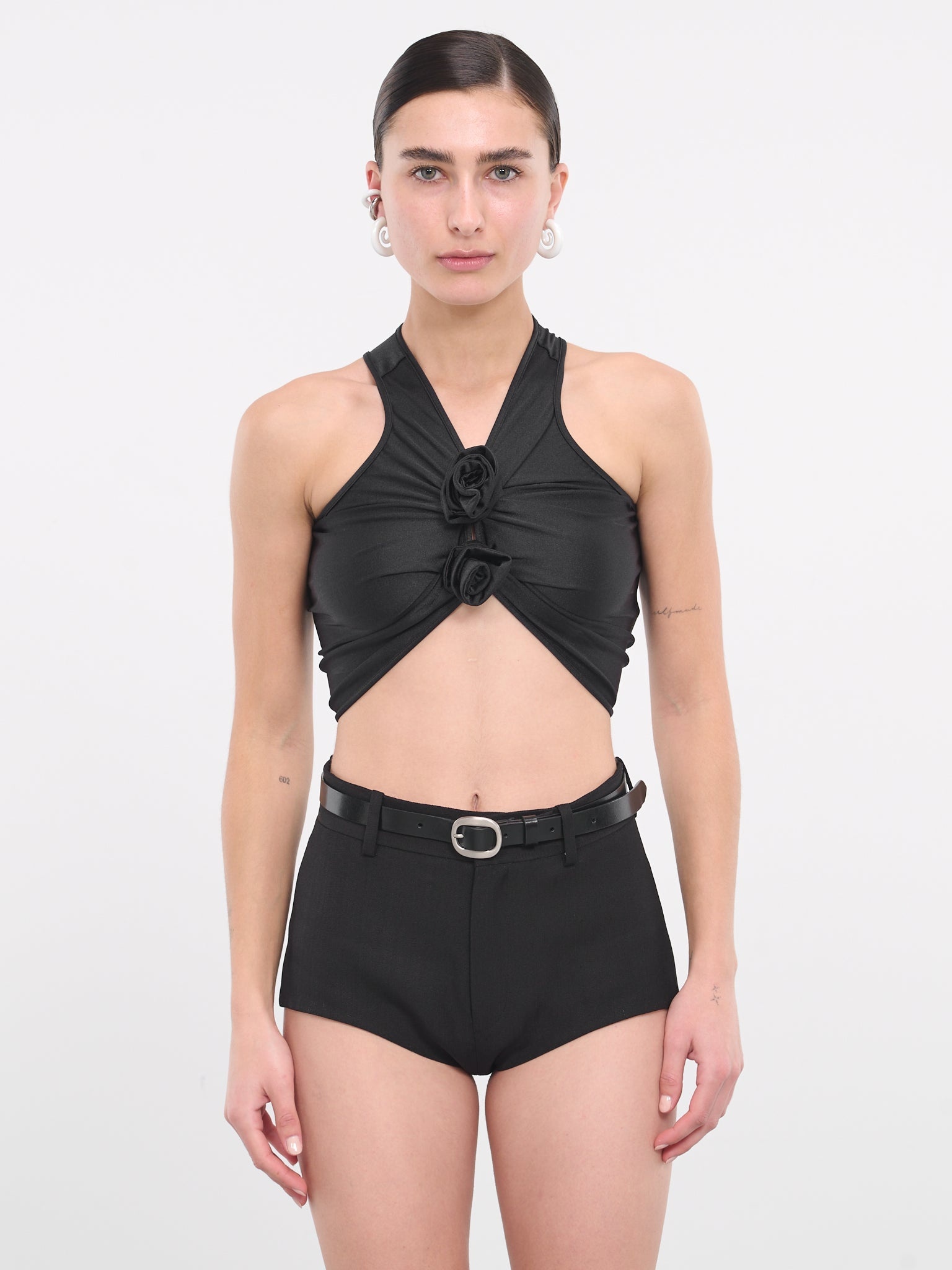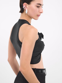 COPERNI top in black, crop top design, paneled stretch satin construction, ruching throughout, v-neckline, shoulder straps, sleeveless, armscyes, front gathered flower appliqués, high-low hemline, cropped length, slim fit. Made in France 80% Polyamide 20% Elastane Standard Sizing Model is 5'7" wearing size XS. Bust: 31" Waist: 24" Hips: 30"