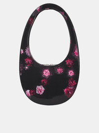 COPERNI bag in black pink, oval-shaped design, leather construction, holographic floral print, fixed top handle, dual-end zip closure, logo woven label, lined, silver-toned metal hardware. Made in Italy