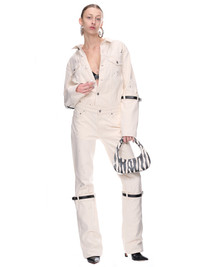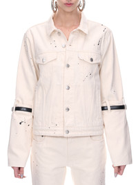 COPERNI jacket in off-white, belted sleeves design, denim construction, splattered details, pointed collar, logo button closure, chest flap & side welt pockets, relaxed fit. Italian Sizing Model is 5'9" 5wearing size 36. Bust: 33" Waist: 24" Hip: 33"