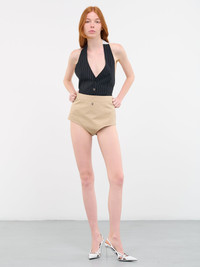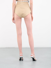 COPERNI shorts in beige, high waist & cut, metal logo detail, concealed side seam zip closure, fitted. Made in Italy Italian Sizing 100% Cotton Model is 5'9" wearing size 36. Bust: 31.5" Waist: 23" Hips: 34"