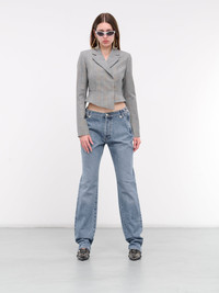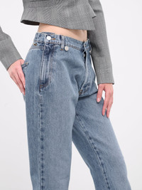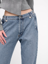 COPERNI jeans in blue, paneled denim construction, mid-rise, belt loops, hip open buttoned flap, front button fastening & concealed zip fly closure, back patch pockets, straight leg, regular fit. 100% Cotton French Sizing Model is 5'10" wearing size 36. Bust: 33" Waist: 24" Hips: 35"