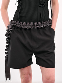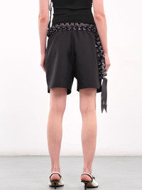 COPERNI shorts in black, paneled construction, waist shirring & ruching, extended draping, logo patch, side pockets, above-knee length, relaxed fit. Standard Sizing Model is 5'8" wearing size S. Bust: 32" Waist: 24" Hips: 35"