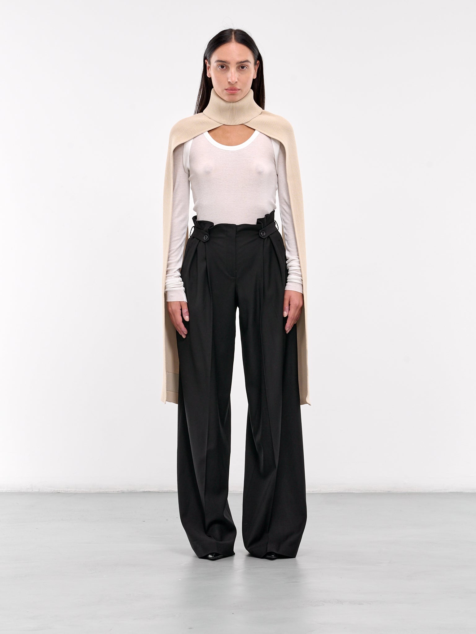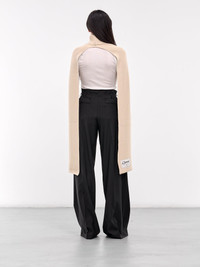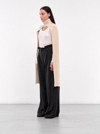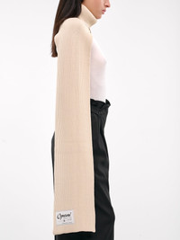 COPERNI scarf in beige, viscose-nylon blend, paneled knit construction, rib-knit, turtleneck, extended scarf, logo patch, fitted. Made in Italy 65% Viscose 35% Polyamide One Size Model is 5'6" wearing size OS. Bust: 31" Waist: 24" Hips: 34"