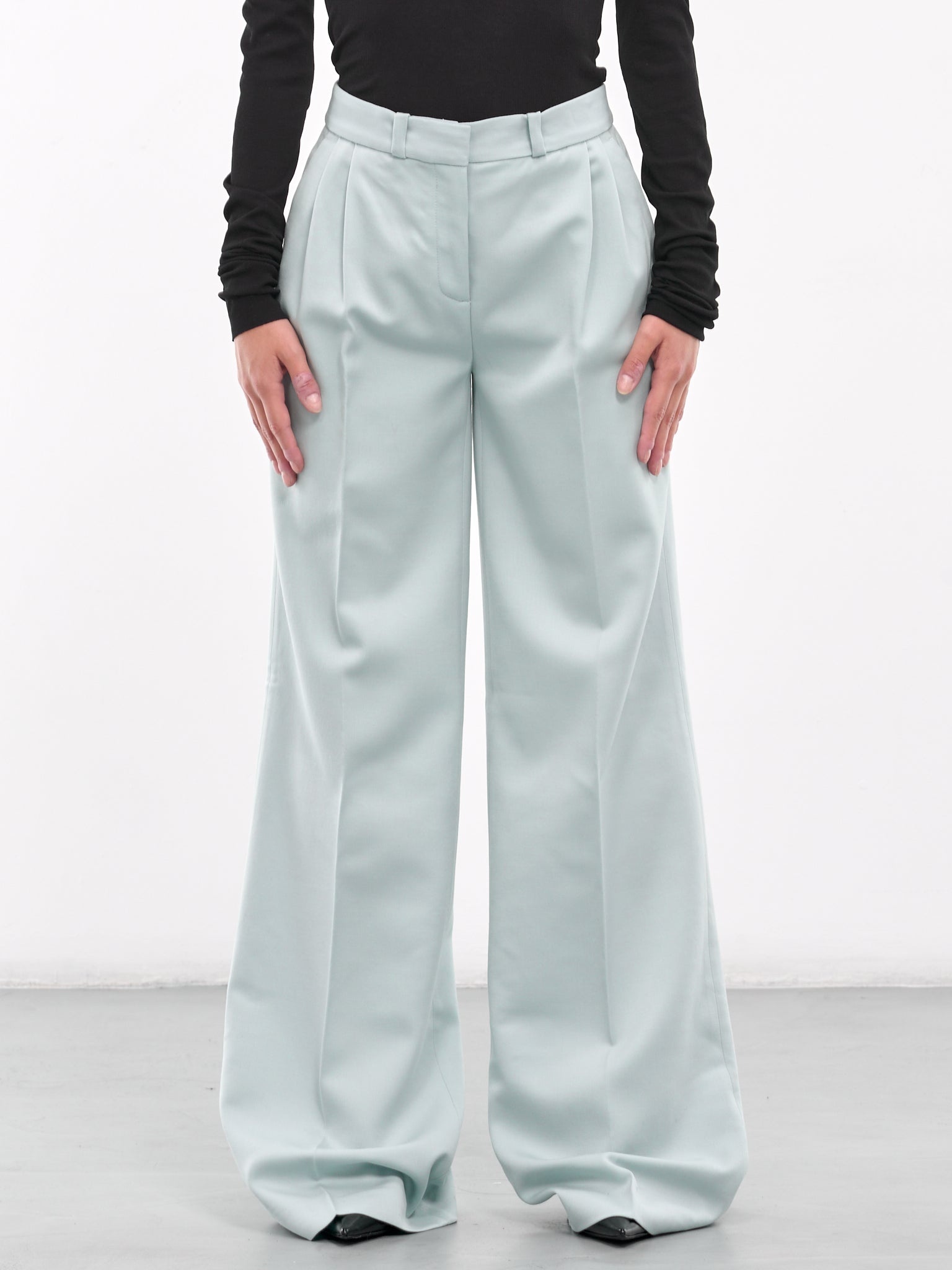 COPERNI pants in green, paneled construction, high waist, belt loops, front concealed zip fly closure, pleated, inset pockets, back buttoned welt pocket, traveler's crease, wide leg, loose fit. Standard Sizing Model is 5'6" wearing size S. Bust: 31" Waist: 24" Hips: 34"