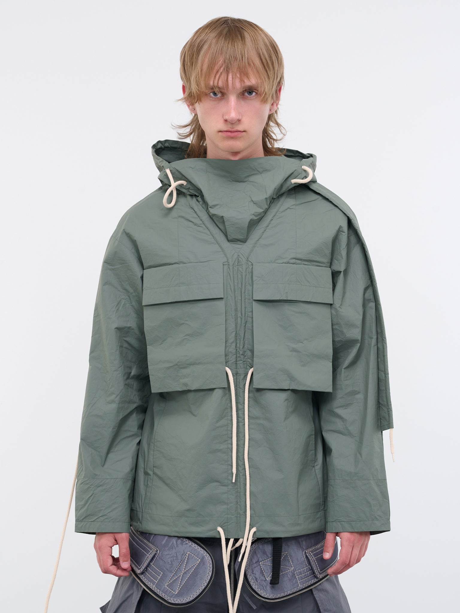 CRAIG GREEN jacket in green, crinkled tafetta, hooded collar, drawstrings throughout, stand collar gusset, chest flap pockets, welt pockets, press-stud cuffs, fully lined, relaxed fit. Made in India Standard Sizing Body - 50% Polyurethane, 50% Polyethylene Lining - 100% Nylon Model is 6’1” wearing size M. Shoulders: 18” Chest: 36” Waist: 28”