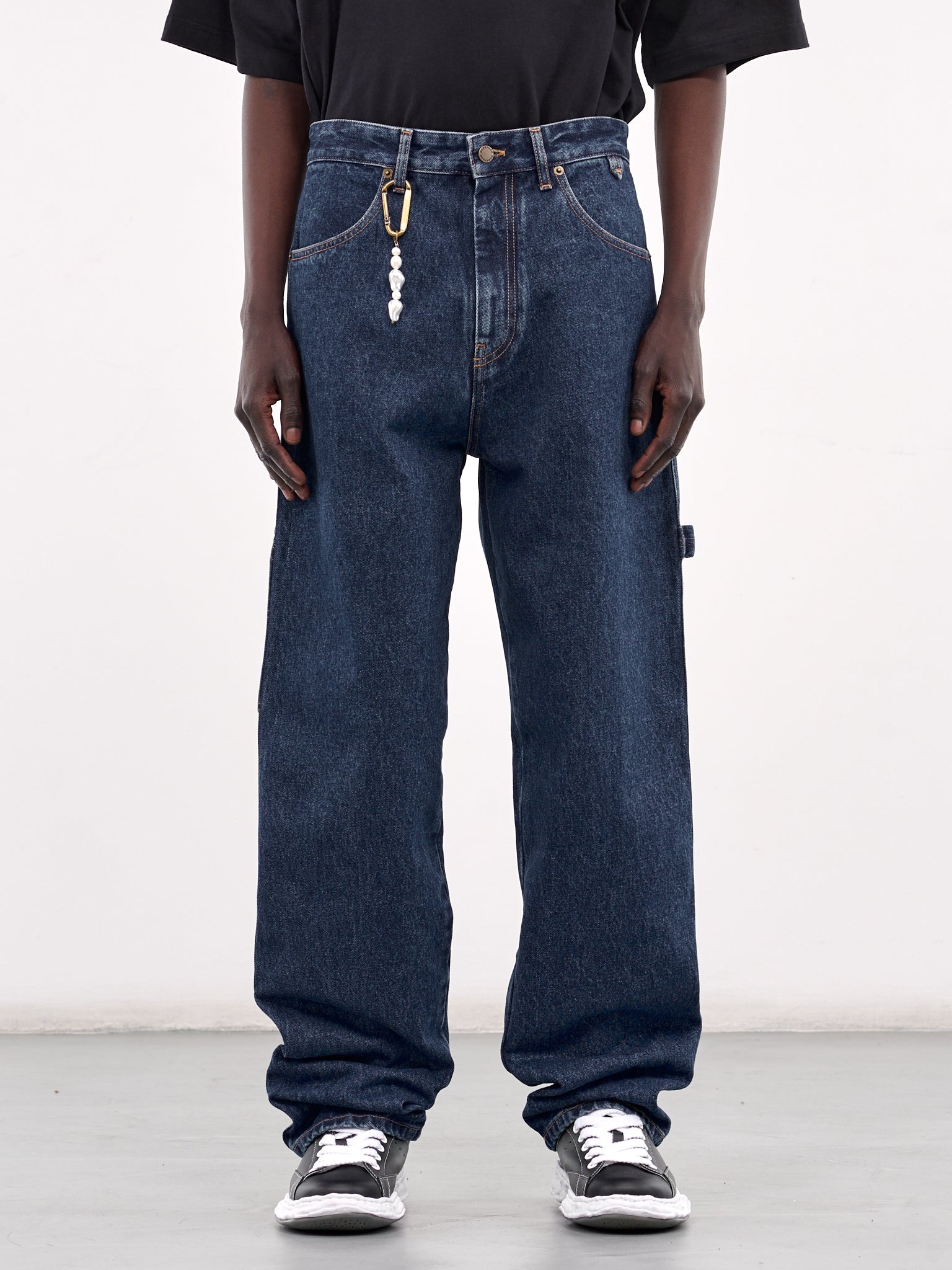 DARKPARK jeans in blue, paneled denim construction, medium wash, belt loops, back logo patch, front button & concealed zip fly closure, carabiner & beaded embellishment, inset pockets, back patch pockets, side carpenter's loop, side patch pocket, straight leg, relaxed fit. Made in Italy 100% Cotton Standard Sizing Model is 5'11.5" wearing size 30. Shoulders: 16" Chest: 32.5" Waist: 30"