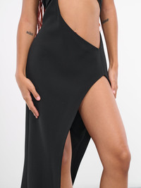 DAVID KOMA black dress, stretch cady, 3D knot halter neck, crystal-embroidered buckle, cut-outs, open leg, back hidden zip closure, maxi length, fitted. Made in UK Main - 52% Acetate, 45% Viscose, 3% Elastane Lining - 64% Viscose, 36% Polyester Trim - 60% Polyurethane, 35% Polyester 5% Elastane Buckle - 100% Glass UK Sizing Model is 5'8" wearing size 8. Bust: 32" Waist: 24" Hips: 34