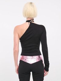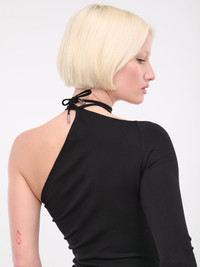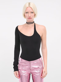 DAVID KOMA bodysuit, paneled stretch jersey construction, asymmetric neckline, halterneck-style, back self-tie fastening, left sleeveless & shoulder strap & armscye, right elongated sleeves, chest cut-out, bottom snap-button fastening, mid-cut, form fit. Made in UK 60% Viscose 35% Polyamide 5% Elastane UK Sizing Model is 5'9" wearing size 8. Bust: 32" Waist: 24" Hips: 34"