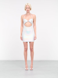 DAVID KOMA dress in silver, paneled rib-knit construction, iridescent finish, halterneck, back self-tie fastening, sweetheart neckline, open back, front cut-out, back concealed zip closure, straight hem, mini-length, form fit. Imported Outer: 100% Lamb Leather Inner: 64% Viscose 36% Polyester Standard Sizing Model is 5'9" wearing size XS. Bust: 32" Waist: 24" Hips: 34"