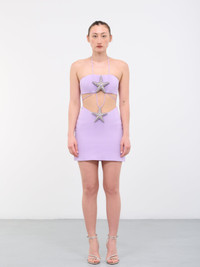 DAVID KOMA dress in purple, stretch cady, crystal hand-embroidered starfish detail, back zip closure, center cut-out, neck spaghetti cross-cross self-tie straps, back zip closure, lined, fitted. Made in UK UK Sizing Body - 52% Acetate, 45% Viscose, 3% Elastane Lining - 64% Viscose, 36% Polyester Detail - 50% Glass, 50% Acrylic Model is 5'8" wearing size 8. Bust: 32" Waist: 26" Hip: 32"