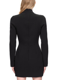 David Koma stretch cady dress in black. High-neck, long-sleeves, plunging tulle insert shaped like a flame, mini silhouette, zip closure at back. Made in the UK UK Sizing Composition: (Shell) 52% Acetate, 45% Viscose, 3% Elastane, (Lining) 96% Acetate, 4% Elastane Model is 5ft 8” and is wearing a size 8. Bust: 33” Waist: 24” Hip: 34"