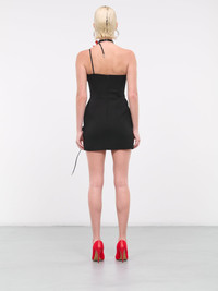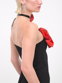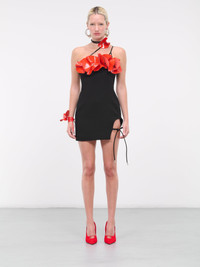 DAVID KOMA black & red dress, wool crepe construction, glossy leather & crystal-encrusted, neck & bust flower embroidery, spaghetti strap halterneck, straight neckline, sleeveless, back concealed zip closure, side self-tie slit, asymmetric hem, lined, mini-length, slim fit. Made in UK Outer: 100% Virgin Wool Contrast: 100% Leather Inner: 64% Viscose 36% Polyester UK Sizing Model is 5'9" wearing size 8. Bust: 32" Waist: 24" Hips: 34"