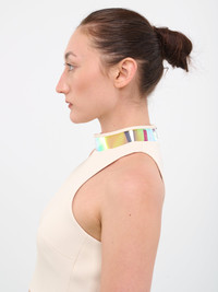 DAVID KOMA top in ivory, stretch cady, iridescent PVC trim, mock neck, back zip closure, sleeveless, cropped, lined, fitted. Made in UK UK Sizing Body - 52% Acetate, 45% Viscose, 3% Elastane Lining - 68% Acetate, 32% Polyester Trim - 100% PVC Model is 5'8" wearing size 8. Bust: 32" Waist: 26" Hip: 32"
