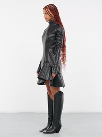 DAVID KOMA black dress, Nappa leather, asymmetric ruffled hem, stand collar, dual zip openings, long sleeves, back hidden zip closure, mini length, slim fit. Made in Turkey Main - 100% Goat Leather Lining - 100% Viscose UK Sizing Model is 5'8" wearing size 10. Bust: 32" Waist: 24" Hips: 34