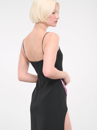 DAVID KOMA dress in black, paneled stretch cady construction, asymmetric neckline, fixed spaghetti straps, sleeveless, armscyes, back concealed zip closure, neck & hip embroidered metallic tube embellishment, deep leg slit, straight hemline, lined, floor-length, slim fit. Made in UK Outer: 52% Acetate 45% Viscose 3% Elastane Inner: 64% Viscose 36% Polyester Application: 100% Polyacrylic UK Sizing Model is 5'9" wearing size 8. Bust: 32" Waist: 24" Hips: 34"