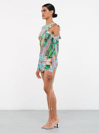 DAVID KOMA dress in multicolor, mesh construction, pearl iridescent print, round collar, shoulder cut-out, hand-embroidered trim, shell chain, long sleeves, drawstring gathered sides, back concealed zip closure, mini length, fitted. UK Sizing 92% Polyamide, 8% Elastane, Metal Model is 5'10" wearing size 8. Bust: 32" Waist: 25" Hips: 35"