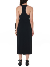 David Koma slim-fit racer back dress in black, lace split ruffled seam design, front slit vent detail, straight hem, tonal stitching. Made in the United Kingdom. Composition - 52% Acetate, 45% Viscose, 3% Elastane Model wears a size 10.