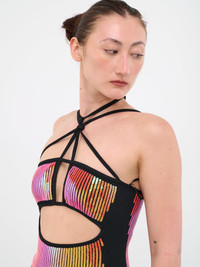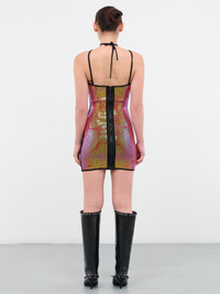 DAVID KOMA dress in multicolor, sequin & stretch knit construction, center cut-out, criss-cross halter neck, self-tie fastening, back zip closure, mini length, fitted. Standard Sizing 84% Rayon, 15% Nylon, 1% Elastane Model is 5'10" wearing size S. Bust: 32" Waist: 25" Hips: 35"