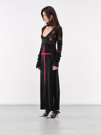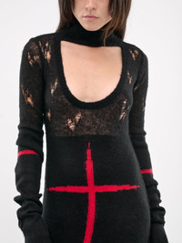 DIDU dress in black, acrylic-nylon blend, paneled knit construction, distressed, jacquard knit cross pattern, scoop neck, long sleeves, straight hem, maxi-length, slim fit. 55% Acrylic 30% Nylon 10% Wool 5% Mohair Standard Sizing Model is 5'8" wearing size S. Bust: 32" Waist: 24" Hips: 33"