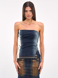 DIDU top in blue, tube top design, paneled denim construction, fading, contrast topstitching, straight neckline, strapless, bust darting, side contrast piping, frayed edges, side vent, straight hemline, slim fit. Standard Sizing Model is 5'8" wearing size S. Bust: 32.5" Waist: 24" Hips: 34"