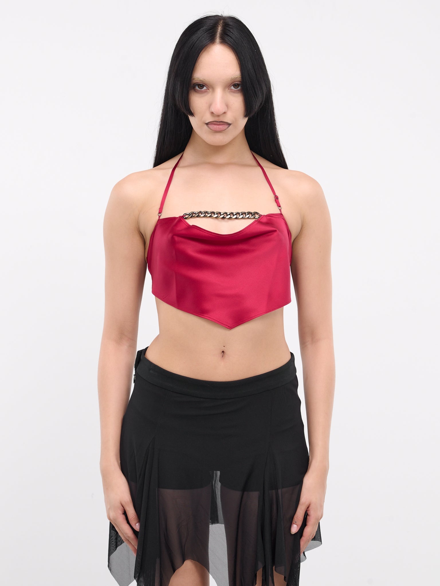 DIDU top in red, paneled silk construction, adjustable halterneck, front chain detailing, draped neckline, sleeveless, back sash self-tie fastening, angled hem, cropped length, slim fit. Made in China 100% Silk Standard Sizing Model is 5'8" wearing size S. Bust: 32" Waist: 26" Hips: 34.5"