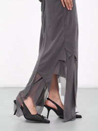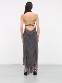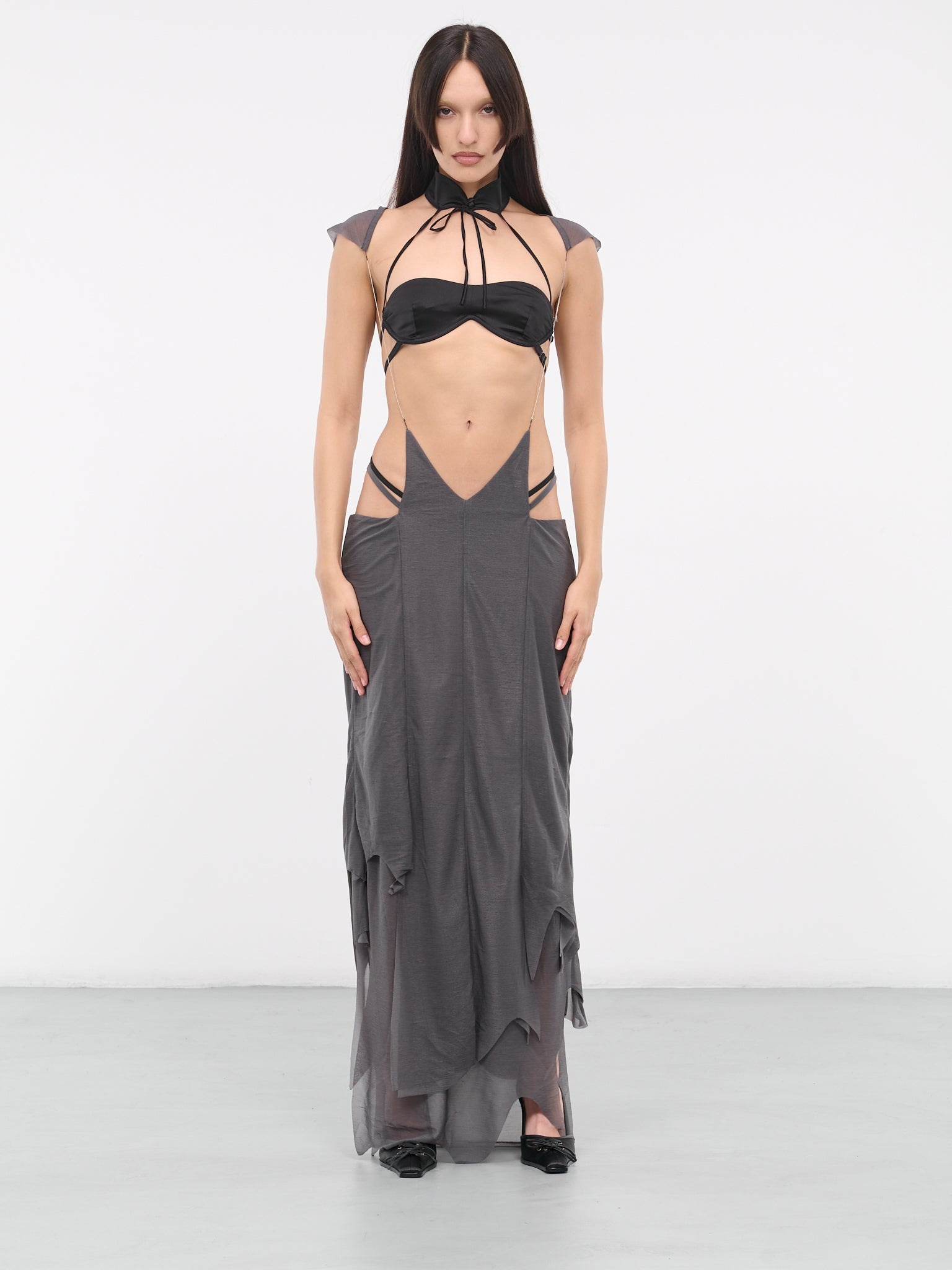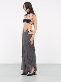 DIDU grey dress, draped design, mixed material construction, sheer & chain shoulder strap, open front & back, asymmetric draping, maxi length, slim fit. Standard Sizing Model is 5'8" wearing size XS. Bust: 32" Waist: 26" Hips: 34.5"