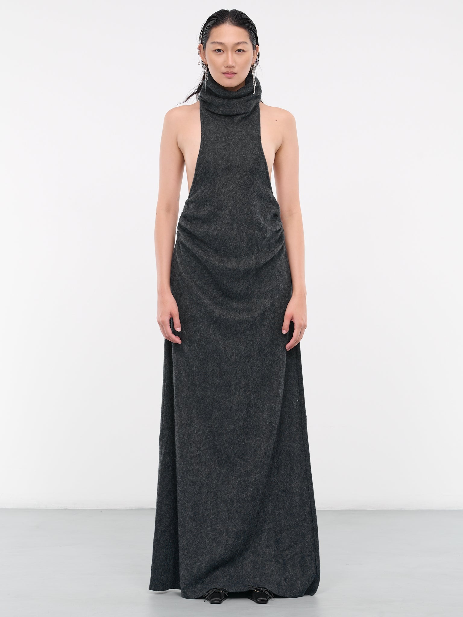 DIDU black dress, draped design, felt construction, stand collar, large armcyes, open back, maxi length, slim fit. Standard Sizing Model is 5'10" wearing size S. Bust: 31" Waist: 23.5" Hips: 35"
