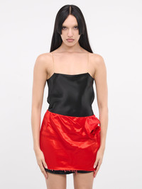 DIDU tank in black, camisole design, acetate-polyester blend, paneled satin construction, gold-tone chain spaghetti straps, straight neckline, sleeveless, back adjustable strap, open back, side concealed zip closure, relaxed fit. 76% Acetate 24% Polyester Standard Sizing Model is 5'8" wearing size XS. Bust: 32" Waist: 26" Hips: 34.5"