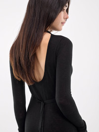 DIDU dress in black, paneled wool knit construction, round neck, front seam detailing, long sleeves, open back, leg slit, straight hem, maxi-length, slim fit. 100% Wool Standard Sizing Model is 5'8" wearing size S. Bust: 32" Waist: 24" Hips: 33"