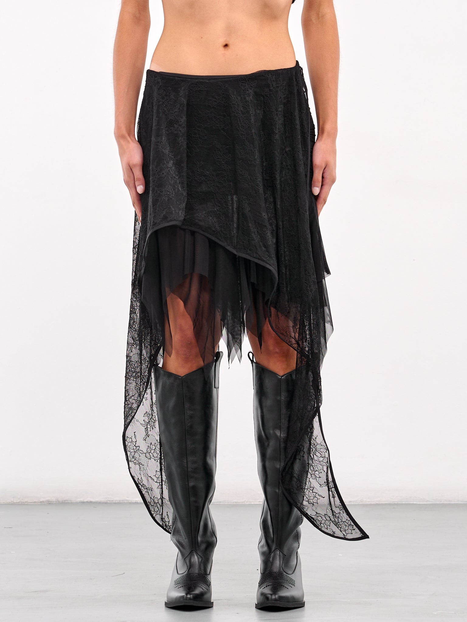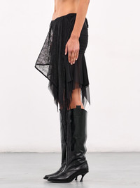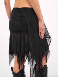 DIDU skirt in black, layered construction, semi-sheer, mid waist, draped lace pattern overlay, wrap-around ruched skirt layering, layered ruffling, asymmetric draped hemline, mini-length, slim fit. Standard Sizing Model is 5'8" wearing size S. Bust: 32.5" Waist: 24" Hips: 34"