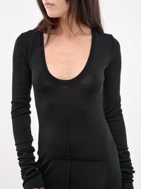 DIDU dress in black, paneled construction, scoop neck, long sleeves, waist adjustable pin-buckle belt, cross-seam detailing, back vent, straight hem, maxi-length, slim fit. Standard Sizing Model is 5'8" wearing size S. Bust: 32" Waist: 24" Hips: 33"