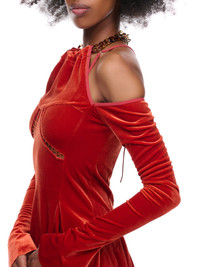 DIDU top in red, off-shoulder draped design, stretch-velvet, tortoise link halter neck, adjustable straps, front cut-out lace detail, elongated long sleeves with flared cuffs, back lace-up fastening, semi-fitted. Imported Standard Sizing 92% Polyester, 8% Spandex Model is 5'8" and is wearing size S. Bust: 32" Waist: 23" Hip: 34"