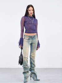 DIESEL pants boots in blue, hydrid design, denim construction, vintage treatment, pants: seam & drape detailing, low-waist, belt loops, exposed zip-fly, three pockets, logo label, skinny fit, boots: inner zip opening, pointed toe, stiletto heel, rubber outsole. US & European Sizing Model is 5'8" wearing size 28/38. Bust: 32" Waist: 26" Hips: 34.5"