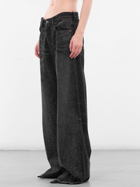 1996 D-Sire-Fsh1 trousers in black denim with fading, whiskering and a wide baggy cut. Featuring: • Baggy fit • Wide leg • Denim construction • Low waist • Belt loops with back logo patch • Front button and zip fly closure • Five-pocket styling • Raw hems • Made in Bulgaria • Main: 95% Cotton 5% Elastane • Standard sizing Model is 5'9" wearing size 26. Bust: 32" Waist: 25" Hips: 34"