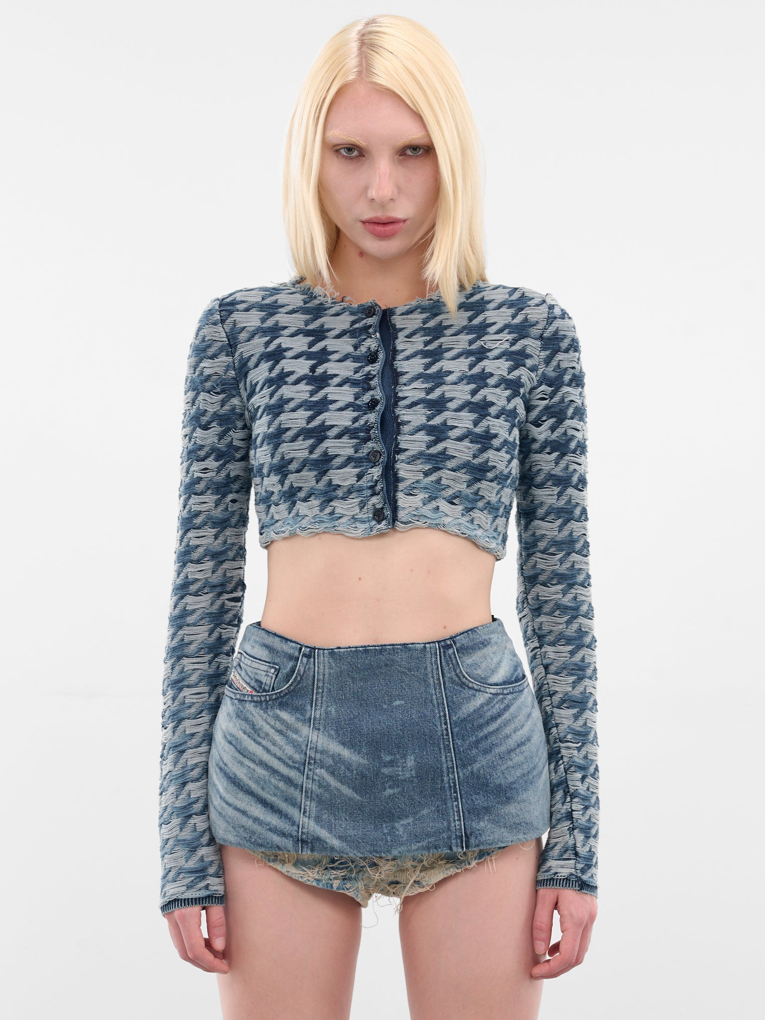 Blue M-Hella cardigan in destroyed fix denim with a cropped cut, houndstooth texture and worn-in floating threads. Featuring: • Slim fit • Destroyed denim construction • Houndstooth pattern • Round neck • Front button closure • Long sleeves • Cropped length • Made in Italy • Main: 100% Cotton • Standard sizing Model is 5'9" wearing size S. Bust: 32" Waist: 25" Hips: 34"