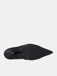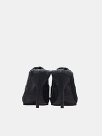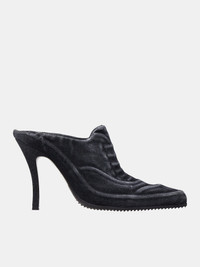 DIESEL mules in black, mule design, paneled denim construction, faded detailing, slip-on, open back, stiletto heel, pointed toe, rubber tread. 100% Cotton European Sizing