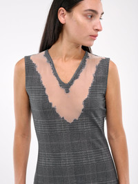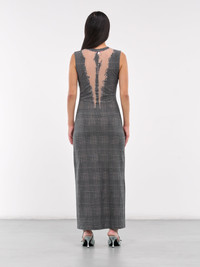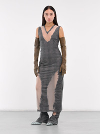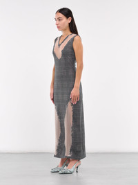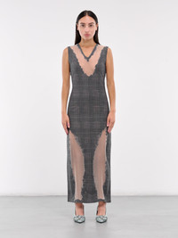 DIESEL dress in grey, paneled construction, Prince of Wales check pattern, semi-sheer paneling, v-neckline, sleeveless, armscyes, straight hem, maxi-length, slim fit. Standard Sizing Model is 5'6" wearing size S. Bust: 31" Waist: 24" Hips: 34"