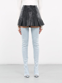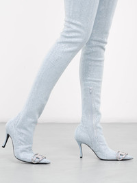 DIESEL blue boots, stretch denim construction, all-over rhinestone-encrusted embellishment, thigh-high, inner side zip closure, covered stiletto heel, pointed toe, rhinestone-encrusted logo plaque, rubber-injected leather sole. Made in Italy Upper: Textile & Glass Sole: Leather Italian Shoe Sizing