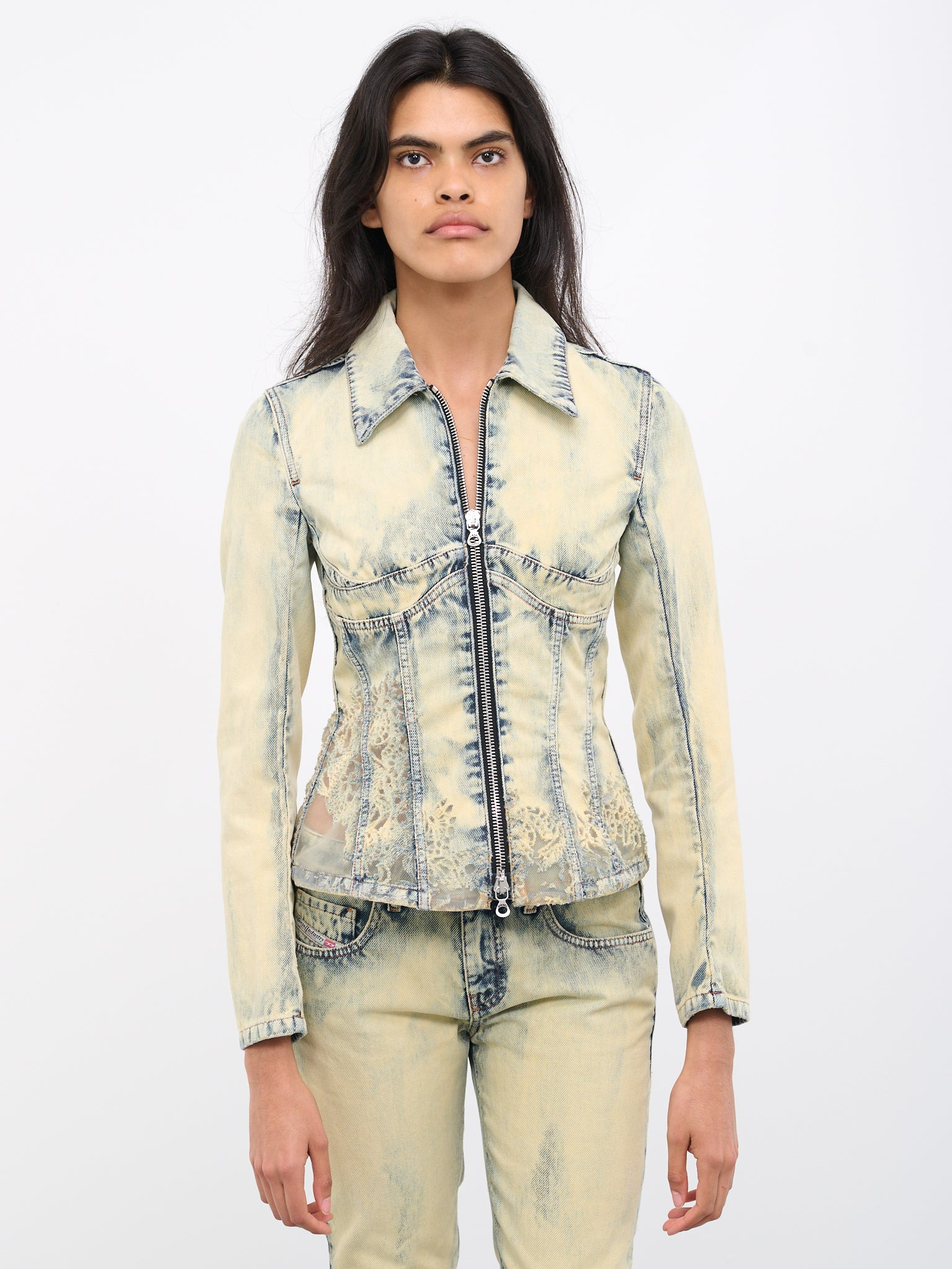 DIESEL jacket in ivory blue, trucker design, denim construction, sun bleached, Devoré burnout technique, lace motif, pointed collar, dual-end zip closure, cinched waist, unlined, slim fit. Standard Sizing 78% Cotton, 22% Polyamide Model is 5'10" wearing size S. Bust: 32" Waist: 25" Hips: 35"