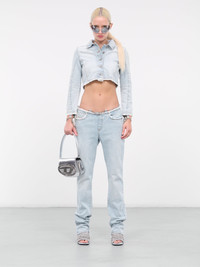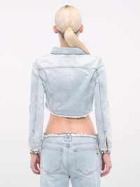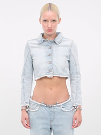 DIESEL light blue jacket, organic denim construction, vintage-effect wash, spread collar, front buttoned placket closure, long sleeves, frayed cuffs & hem, cuffs detachable chain detailing, straight hemline, cropped length, slim fit. 100% Cotton Standard Sizing Model is 5'9" wearing size S. Bust: 32" Waist: 24" Hips: 34"